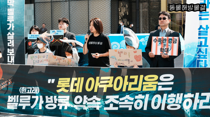 이날 기자회견에 참여한 단체 활동가와 시민들은 ‘벨루가 죽이는 롯데’, ‘롯데는 벨루가 방류 약속 이행하라’라고 쓰인 만장을 들고 롯데월드 타워 주변을 행진하는 퍼포먼스를 펼치기도 했다.
