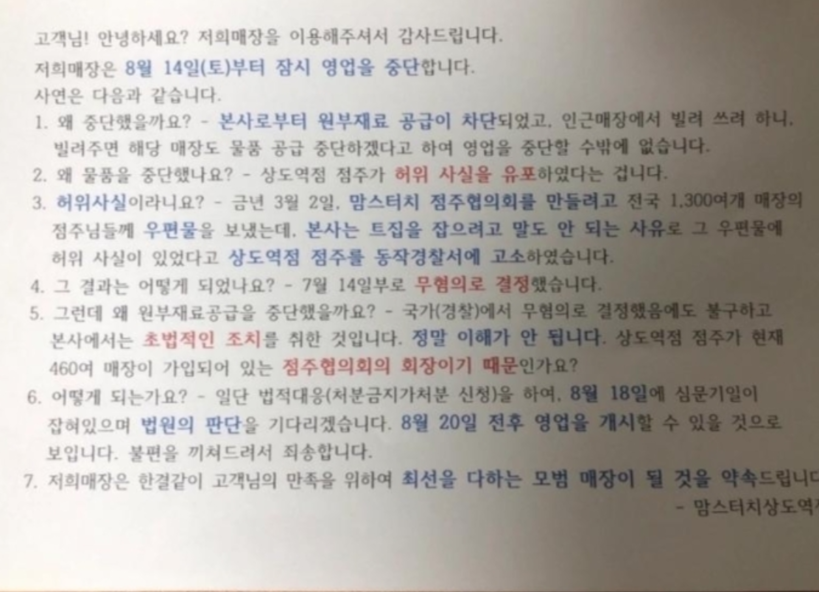 이후 맘스터치 본사는 상도점에 대해 지난 3일 가맹계약을 해지했고, 8일부터는 물품 공급을 중단했다.