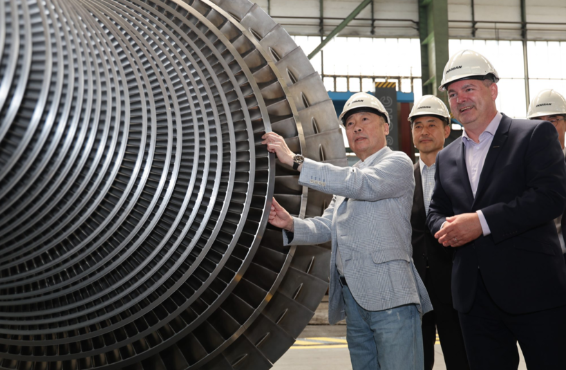 ▲ 박정원 두산그룹 회장이 체코 플젠 시에 위치한 두산스코다파워를 방문해 원전 핵심 주기기인 증기터빈 생산현장을 살펴보고 있다. (사진=두산그룹 제공) |