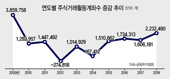 [일요주간 = 남원호 기자] 지난달 금융투자협회의 발표에 따르면 지난해 말 주식거래 활동계좌는 2702만 1073개로 전년대비 223만 2490개가 늘었다고 발표했다. 지난해 말 기준 경제활동인구 (2785만 2000명)대비 주식거래활동계좌비중은 98%에 달한다. 개인투자자 1명이 복수의 증권계좌를 가지고 있다고해도 경제활동인구의 상당수가 증권투자에 참여하고 있다고 봐도 무방할 것이다