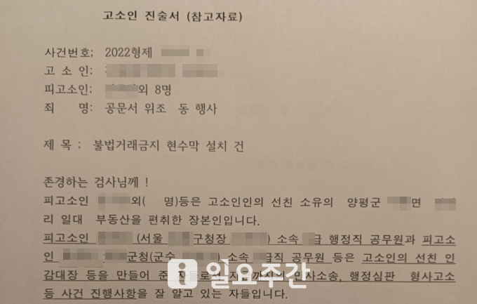 진정서에서 B 씨는 "공문서위조죄에 대해서는 공소시효가 만료돼 위조공문서행사죄에 대해서만 고소를 할 수 있어 정보공개 등을 통해 추가증거를 확보해 고소를 하게됐다"며 "선친은 양평군에 다수의 토지가 있었고 1995년 5월 10일 △△면 ○○리 34x번지 주소지로 사망신고를 했다. 이후 제 3자들이 가공의 주소(415-x번지)를 만들어 공문서인 인감대장, 인감증명발급대장 등을 위조해 허위 매매계약서로 토지를 강탈했다"고 주장했다.