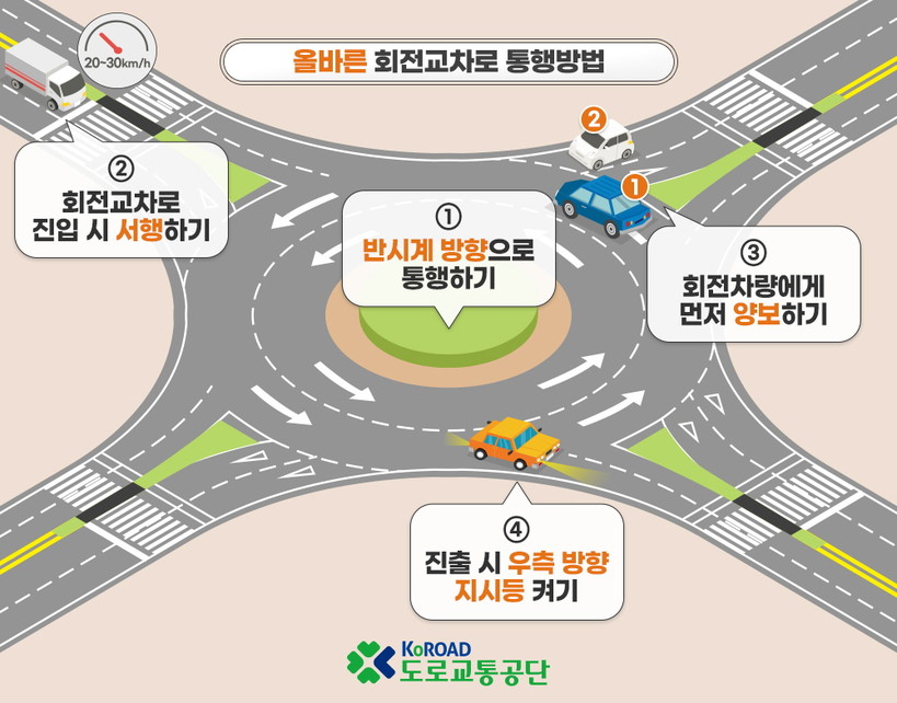 도로교통공단은 회전교차로 통행방법에 대한 국민 인식을 높여 교통사고를 예방하기 위해 회전교차로 통행방법 준수를 강조했다.