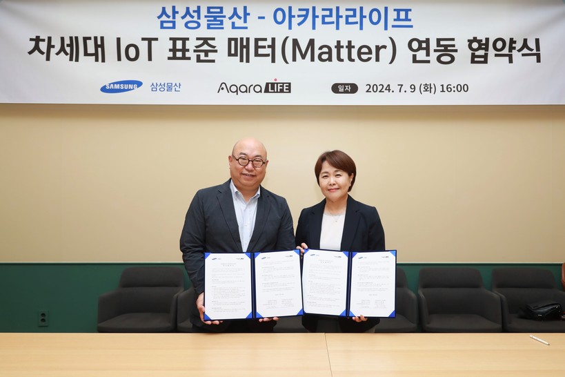 삼성물산 건설부문(이하 삼성물산)이 9일 서울 송파구 문정동에 위치한 래미안갤러리에서 IoT 전문기업 '아카라라이프'와 매터(Matter) 기반의 스마트홈 기기 연동 활성화를 위한 업무협약을 체결한다고 밝혔다.