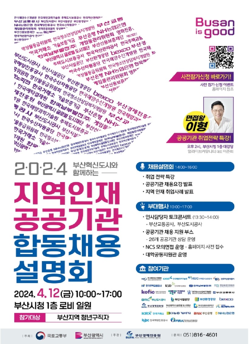 부산시와 국토교통부가 공동 주최하고 부산경제진흥원이 주관하는 이번 행사는, 부산혁신도시 이전공공기관뿐 아니라 시 산하 공공기관, 금융 및 유관기관까지 참여 범위를 확대해 총 26개 기관이 채용계획을 안내하는 대규모 설명회로 개최된다.