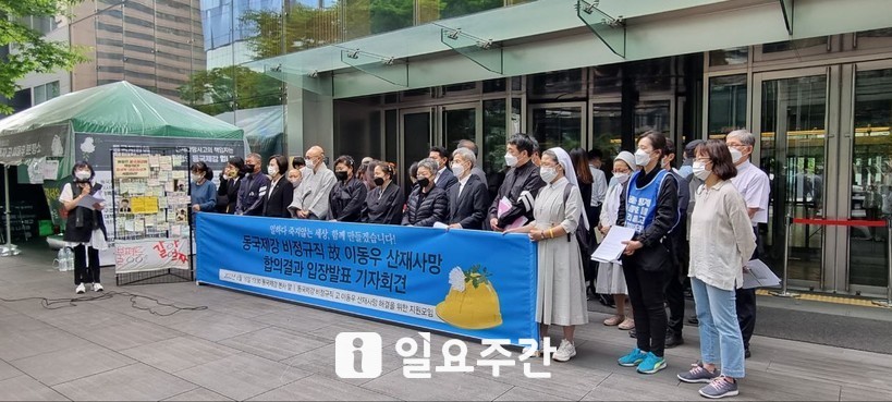 ‘고 이동우 동국제강 비정규직노동자 산재사망사고 해결 촉구 지원모임(이하 해결촉구모임)’은 지난 16일 서울 중구 동국제강 본사 앞에서 기자회견을 열고 “고인이 돌아가신지 88일이 지난 오늘에서야 사측과 유족이 여러 차례 협상 끝에 합의하고 조인식을 했다”라고 밝혔다.