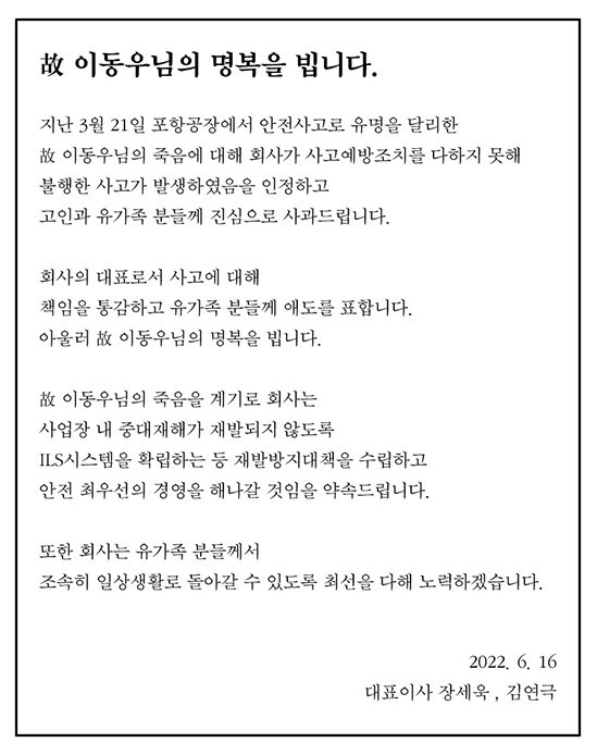 -동국제강 포항공장 30대 하청 노동자 고 이동우 씨 숨진 지 88일 만에 사과