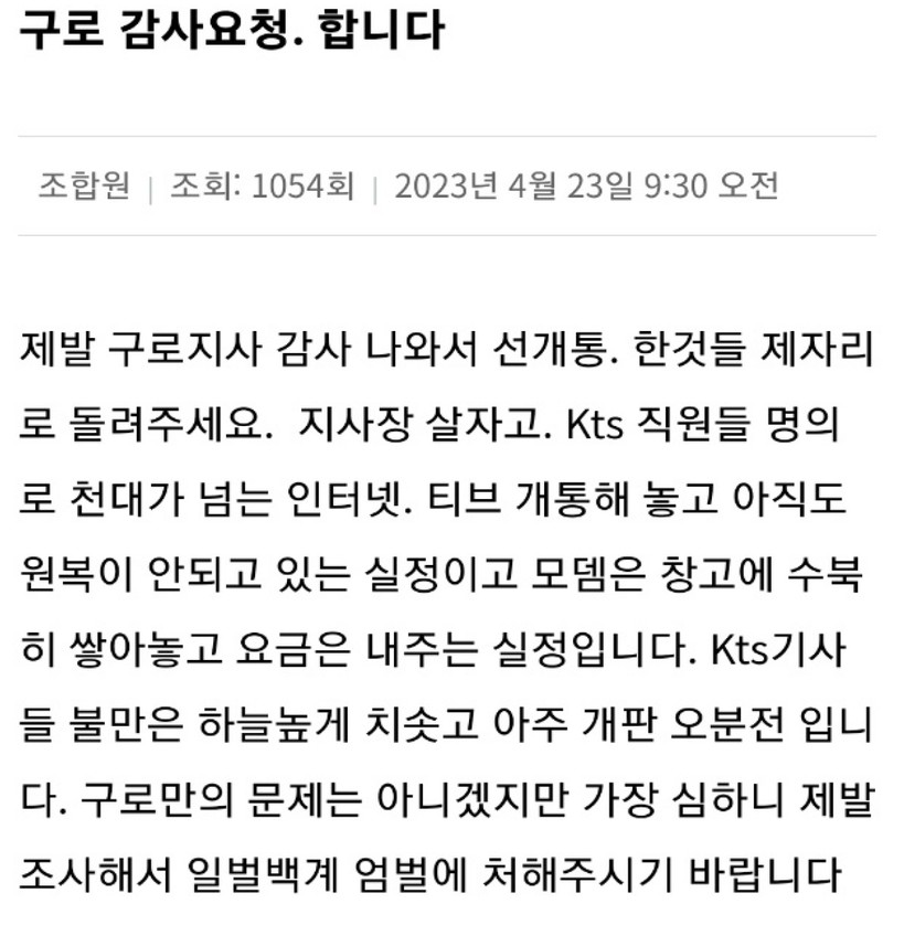 [일요주간 = 이수근 기자] “유료방송 가입자 1위 기업인 KT 내에서는 본사, 자회사 상관없이 허수영업(자뻑)이 심각한 수준으로 확인됐다. KT서비스북부 서부본부 구로지사에서 직원들 명의로 수백 회선의 인터넷, TV 허수 개통이 있음을 확인했다.”