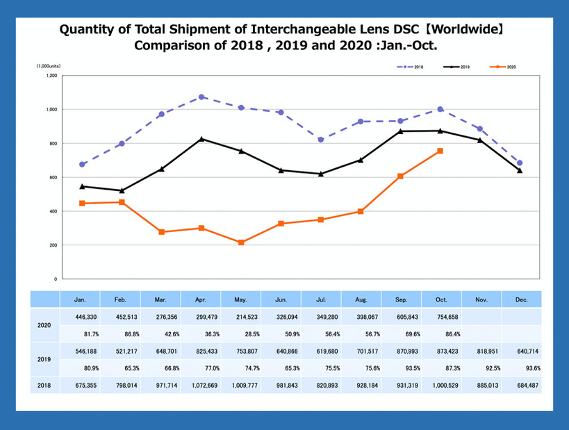 10월 보고서를 살펴보면 고정렌즈 카메라와 렌즈 교환식 카메라 모두를 포함한 총 디지털 카메라 판매량은 113만 대가 선적되었다. 이는 2019년 10월 대비 출하량이 여전히 22.8% 줄어든 것이지만, 같은 달 2019년 대비 출하량이 50% 안팎을 맴돌고 있는 지난 6개월에 비해 출하량이 월등히 향상된 수치이다.