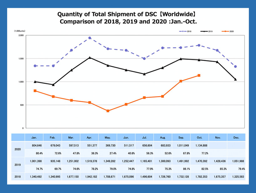 하지만 일본 카메라 및 이미지 제품 연합(CIPA, Camera & Imaging Products Association in Japan)에서 발표한 10월 리포트에 따르면 카메라 시장이 다시 살아나고 있으며 코로나 19로 인한 경기 침체에서 예년 수준으로 회복되어 가는 것으로 나타났다.