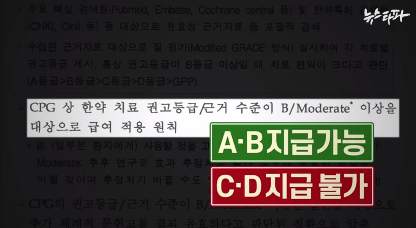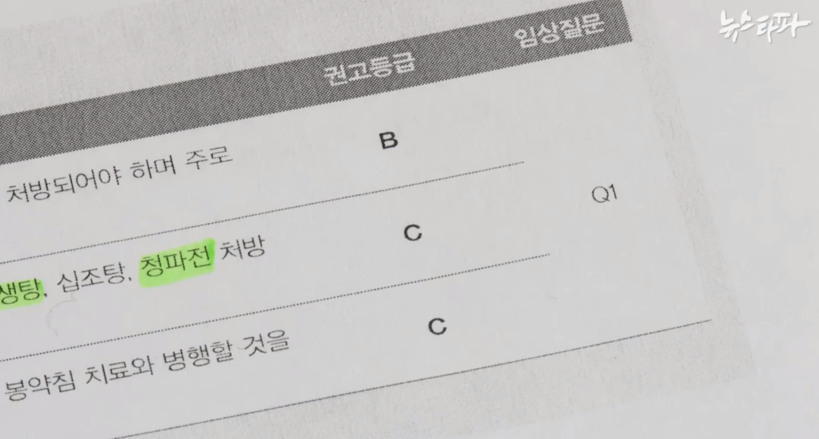 '뉴스타파'는 "(청파전은) 권고 등급이 C나 B에 해당하며 원칙적으로 건강보험 급여 대상이 될 수 없다"며 "그런데 2015년 허리디스크 임상 근거 연구 당시 청파전은 독활기생탕 등과 함께 C 등급을 받았다"고 전했다.