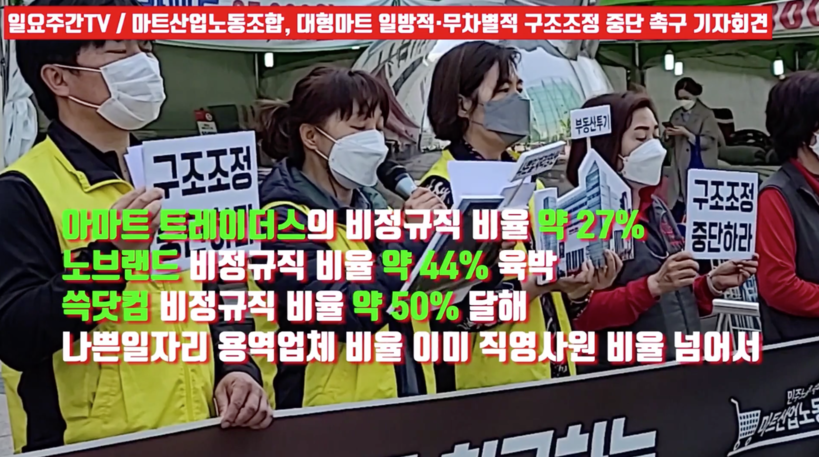 [일요주간TV = 김상영 기자] 지난 20일 오전 10시 서울 홈플러스 영등포점 앞에서 게최된 마트산업노동조합 기자회견에 참석한 홍현애 이마트지부 서울본부장은 국민 키다리아저씨로 등극한 정용진 신세계그룹 부회장이 운영하는 이마트에서 비정규직 직원이 늘리며 나쁜 일자리를 양산하고 있다고 규탄했다.