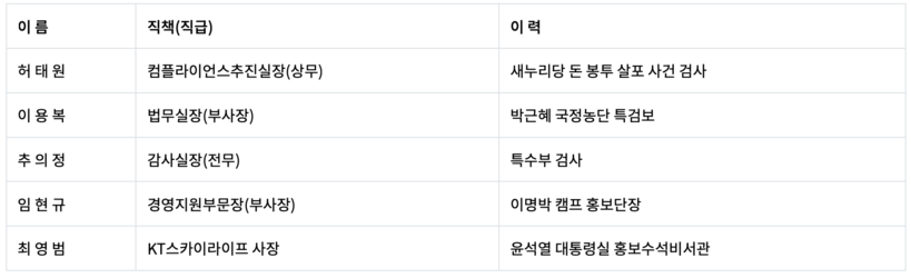 이어 “2024년 2월에는 컴플라이언스추진실장(상무)에 검사 출신인 허태원 변호사를, 감사실장(전무)에 특수부 검사 출신인 추의정 변호사를 각각 선임했다”며 “KT의 핵심 계열사 중 하나인 KT스카이라이프 신임 대표에 최영범 전 대통령실 홍보수석비서관을 선임했다”고 덧붙였다.