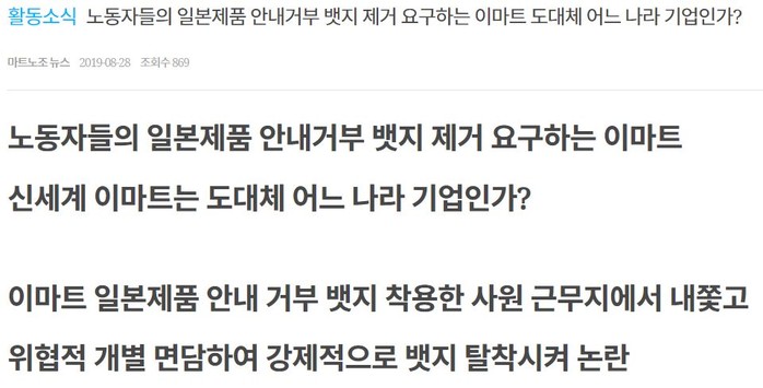 이마트가 일본 제품 안내 거부 뱃지를 착용한 노조원을 근무지에서 내쫓았다며 마트산업노조(이하 마트노조)가 지난달 28일 '노동자들의 일본제품 안내거부 뱃지 제거 요구하는 이마트 도대체 어느 나라 기업인가?'라는 제목의 보도자료를 발표하는 등 강력 반발하고 나서 파장이 커지고 있는 가운데 전국 수십명의 이마트 일렉트로마트 애플샵 매니저가 속해 있는 단체 카톡방에서 방문 여성 고객의 외모를 성적으로 비하, 유희화 하고 심지어 고객의 노트북에 들어있던 개인사진을 유출하며 성희롱을 일삼았다는 폭로가 터져나와 이마트가 곤혹스러운 처지에 놓였다.