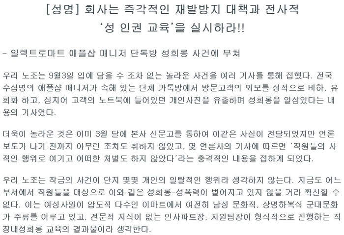 이와 관련 마트노조는 4일 '회사는 즉각적인 재발방지 대책과 전사적 '성 인권 교육'을 실시하라!'는 제목의 성명을 통해 "입에 담을 수 조차 없는 놀라운 사건을 접했다"면서 "더욱이 놀라운 것은 이미 3월에 본사 신문고를 통해 이 같은 사실이 전달됐지만 언론보도가 나기 전까지 아무런 조치도 취하지 않았고 몇 언론사의 기사에 따르면 '직원들의 사적인 행위로 여기고 어떠한 처벌도 하지 않았다'라는 충격적인 내용을 접하게 됐다"면서 회사의 안이한 대처를 비판했다.