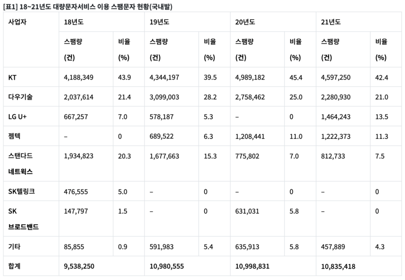 최근 4년(2018~2021년) 간 대량문자서비스를 이용한 스팸 문자 현황을 보면 KT가 압도적인 1위다. 매년 400만 건이 넘는 스팸을 발송하고 있다. 이외에도 다우기술이 매년 200만 건 이상을 발송하며 2위를 기록하고 있다.