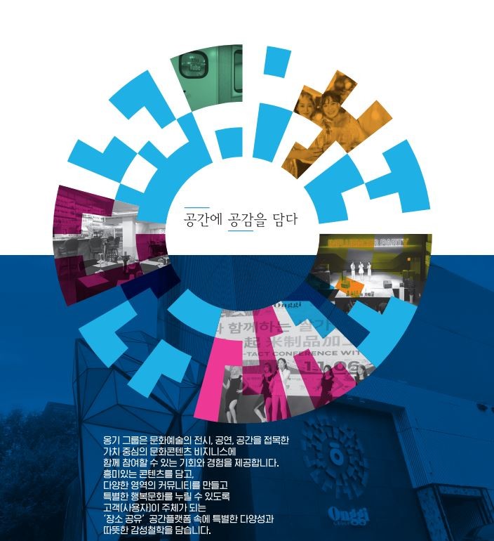 이렇듯, 옹기그룹은 기업과 개인의 커뮤니티 공간을 만들어 고객(사용자)이 주체가 되는 공간 플랫폼을 제공합니다. 필요한 콘텐츠를 다양하게 활용할 수 있도록 ‘장소를 공유’하고 있습니다. 미니콘서트, 공연기획과 마케팅 커뮤니케이션을 통한 홍보 이슈를 제공, 신문화 콘텐츠를 구축하는데 기여합니다.