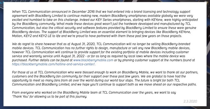 | ▲ 블랙베리 생산 종료를 알린 안내문 (이미지=블랙배리) |