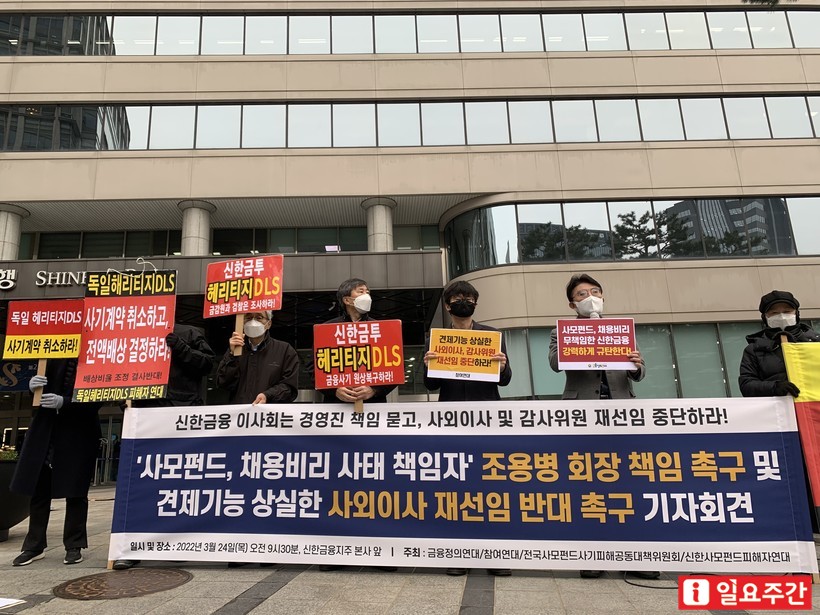 25일 금융권에 따르면 전날 신한금융지주는 서울 중구 신한금융지주 본사에서 정기 주총을 열고 신규 사외이사와 임기 만료를 앞둔 기존 사외이사 7명을 재선임했다. 1500억원 규모의 자사주 소각과 주당 1960원 배당도 의결했다. 같은 날 오전, 금융정의연대, 참여연대, 사모펀드 사기피해 공동대책위 관계자들은 주총 전 본사 앞에서 펀드 부실 판매와 사외이사 재선임을 반대하는 기자회견을 열었다.