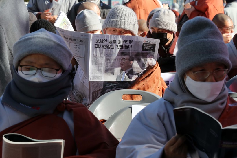 ▲ 종교편향 근절과 한국불교 자주권 수호를 위한 '전국승려대회'에 참석한 한 스님들이 21일 서울 종로구 조계사 대웅전 앞에서 행사 시작을 기다리며 신문을 보고 있다. (사진=뉴시스) |