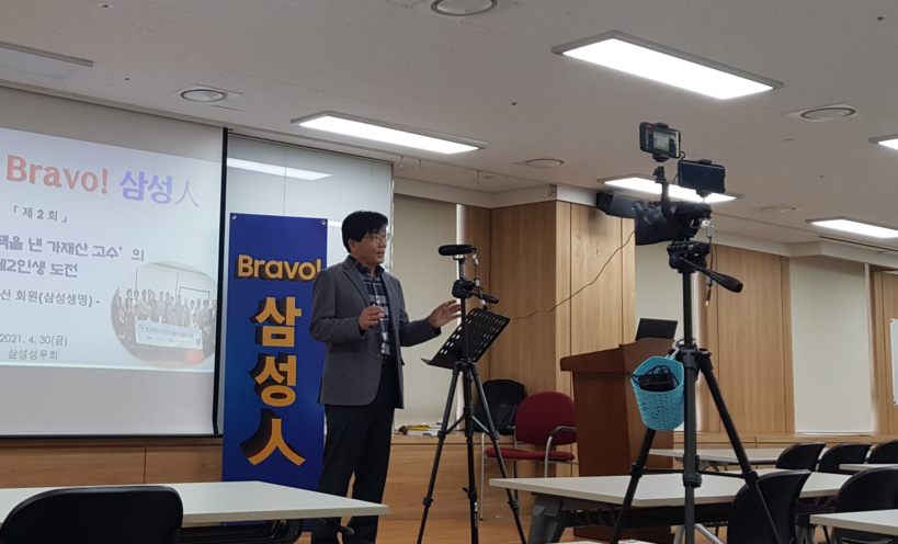▲ 필자가 삼성 퇴임 임원 모임인 성우회에서 출판기년회로 하는 사전장례식에 대한 강의를 하고 있다.