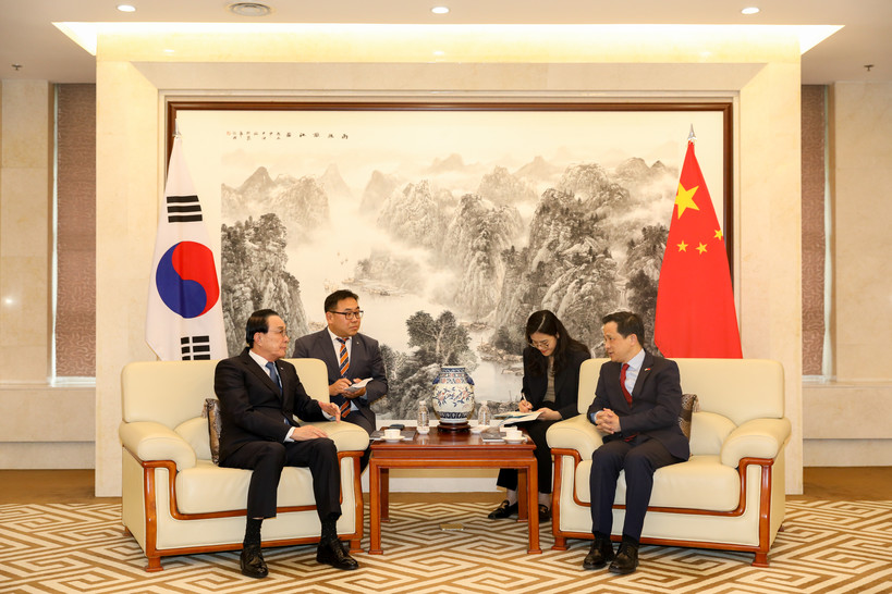 ▲ 노동진 수협중앙회장(왼쪽)이 23일 다이빙 주한중국대사에게 침수 사고에서 국내 어선원 전원을 구조한 중국 해양경찰 측의 활약에 대한 감사의 뜻 전달하고 있다. (사진=수협중앙회 제공) |