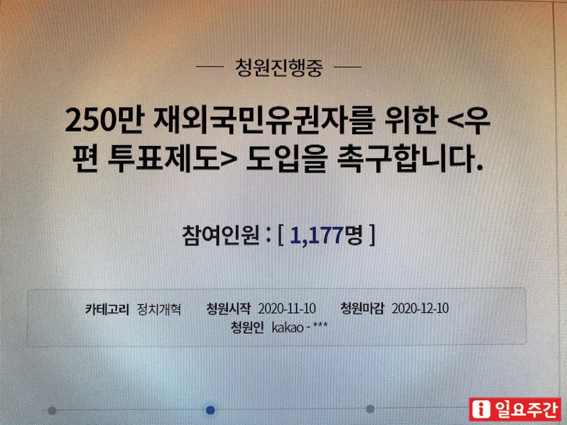 [일요주간/샌프란시스코=정승덕 기자] 올해 미국 대선에서 신종 코로나바이러스 감염증(코로나19) 사태로 일부 유권자들이 우편투표로 선거에 참여해 주목을 받은 가운데 지난 10일 청와대 국민청원게시판에 재외국민의 우편투표를 도입해 달라는 국민청원이 올라와 현재 1175명이 참여했다.