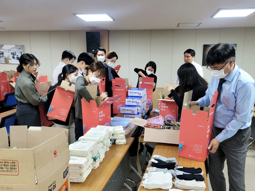 ▲신협 관계자들이 소재지 인근의 어려운 이웃에게 전달하기 위한 생필품을 ‘어부바 박스’에 담아 포장하는 모습.(사진=신협중앙회) |