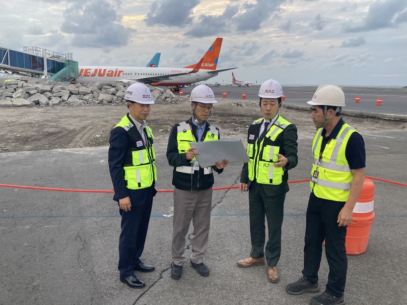 | ▲ 13일, 제주국제공항에서 윤형중 한국공항공사 사장(왼쪽으로부터 3번째)이 계류장 내 공사현장을 점검하고 있다.(사진=한국공항공사) |
