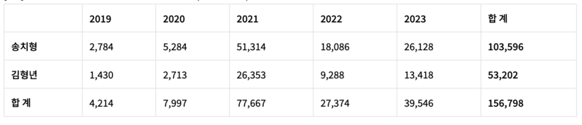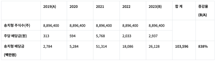 두나무 송치형 회장의 배당금을 살펴보면 최근 5년 간 총액은 1035억 원으로 송치형 회장의 배당금은 2019년 27억 원에서 2023년 261억 원으로 2019년 대비 무려 838% 급증했다.