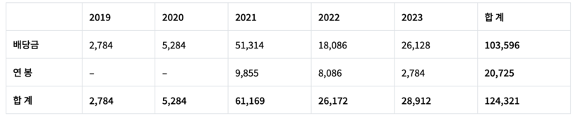 두나무 공동창업자이면서 주요 대주주인 송치형 회장과 김형년 부회장의 최근 5년 간 배당금 합계를 살펴보면 2019년 42억 원, 2020년 79억 원, 2021년 776억 원, 2022년 273억 원, 2023년 395억 원이며 5년 간 총액은 1567억 원에 이른다.