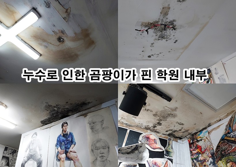 누수로 인한 곰팡이도 학원 천장 여러 곳에서 발견됐다. 곰팡이로 인한 퀴퀴한 냄새가 환기해도 사라지지 않아 학생들의 불만이 많은 것으로 전해진다. 더욱이 곰팡이는 폐렴, 천식, 비염과 같은 호흡기 질환부터 무좀, 아토피 등 피부질환을 유발하는 것으로 알려져 있다. 미대 입시를 전문적으로 하는 학원 특성상 주 고객으로 미성년 학생이 많아 제보자는 근심과 우려가 깊어진다고 했다.
