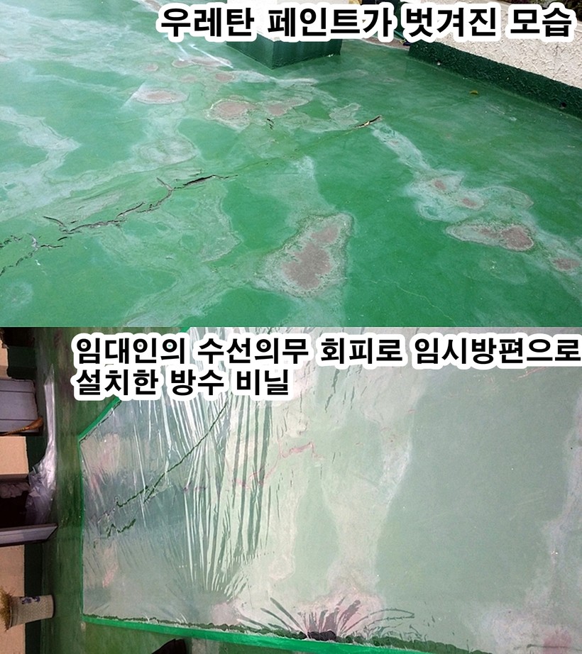| ▲ 천장 누수 피해를 호소하자 세정은 2009년, 2015년 보수 공사를 진행했다. 위 사진은 우레탄 페인트를 덧칠하지 않아 자외선과 바람으로 부식된 모습이다. 아래는 우레탄 페인트 위에 임차인이 사비로 구매한 방수 비닐을 바닥에 덮는 모습이다<사진=제보자 제공> |