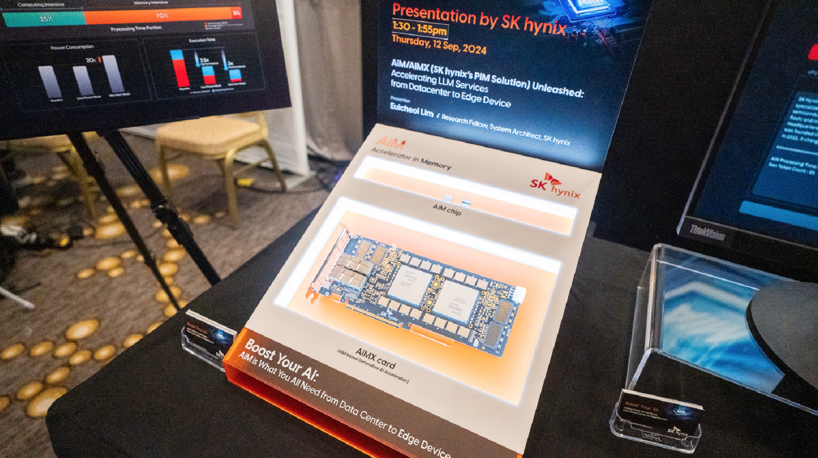 SK하이닉스는 이번 AI 하드웨어 서밋에서 ‘데이터센터부터 엣지 디바이스(인간과 매일매일 접촉하며 데이터를 만들어내는 기기)까지, AI 성능을 가속하는 AiM(Accelerator-in-Memory, SK하이닉스의 PIM 반도체 제품명 PIM은 메모리 반도체에 연산 기능을 더해 인공지능과 빅데이터 처리 분야에서 데이터 이동 정체 문제를 풀 수 있는 차세대 기술)’이라는 슬로건을 걸고 가속기 카드인 AiMX(AiM based Accelerator, GDDR6-AiM 칩을 사용해 대규모 언어 모델에 특화된 SK하이닉스의 가속기 카드 제품) 등 AI 시대를 위한 기술을 선보였다.