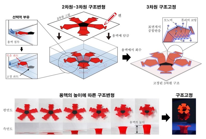 공동1저자인 이수민 석박사통합과정 연구원은 “보드마카로 그린 그림이 물에 떠오르는 현상을 그냥 넘기지 않고 흥미롭게 생각했기에 3차원 구조 제작 기술로 발전시킬 수 있었다”고 했다.