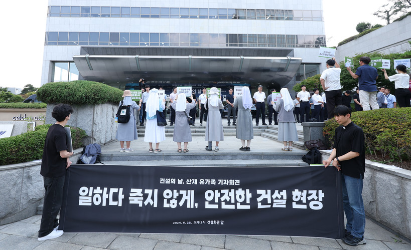▲ 건설현장 산업재해 사망 노동자 유가족과 건설노조, 시민단체 회원들이 지난 6월 26일 건설의 날 기념식이 열리고 있는 서울 강남구 건설회관 입구에서 건설현장 안전을 촉구하는 피케팅을 하고 있다. (사진=newsis) |