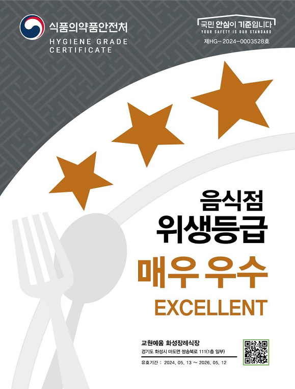 식품의약품안전처 주관 식품접객업소 위생등급제 평가서 최고 등급 받아