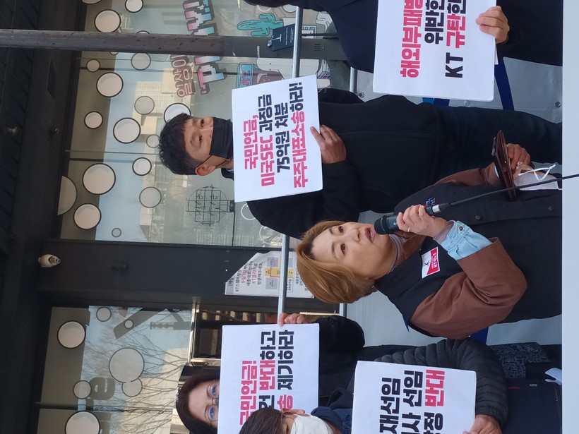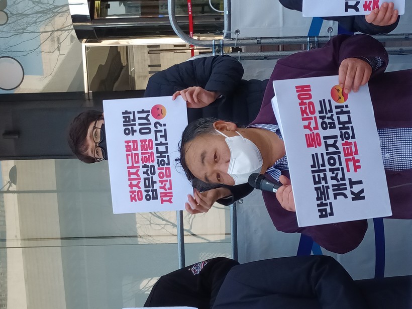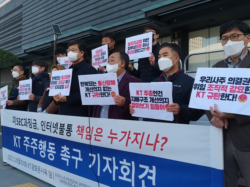 참여연대, KT새노조 등은 28일 서울 종로구 KT 광화문 사옥 앞에서 기자회견을 열고 “이번 KT 주총 안건을 보면, 이사의 선임, 정관의 변경 등으로 KT를 정상화하고 ESG 경영에 맞게 회사를 혁신하기에는 대체로 부족”하다며 “국민연금 등 KT 주주들이 나서서 주총에서 횡령 이사 연임, 이해관계 논란 이사 선임 등 문제 안건을 반대하고 미국 SEC 과징금 등 회사에 손해를 끼친 경영진에 대해 주주대표 소송을 제기해야 한다”고 말했다.