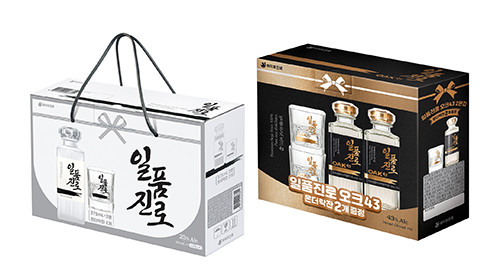하이트진로는 23일부터 증류식 소주 ‘일품진로’(알코올 도수 25도), ‘일품진로 오크43’(43도)를 술과 술잔으로 구성된 선물세트를 판매한다고 밝혔다.