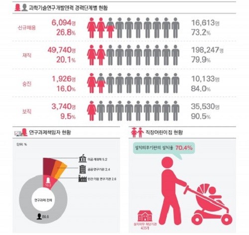 과학기술정보통신부와 한국여성과학기술인지원센터(WISET)가 발표한 여성과학기술인의 육성·지원을 위한 기초자료인 ‘2017년도 여성과학기술인력 활용 실태조사 결과’에 따르면, 과학기술인력 중 여성비율은 2016년 19.3%(4만6269명)에서 2017년 20.1%(4만9740명)로 증가했다.