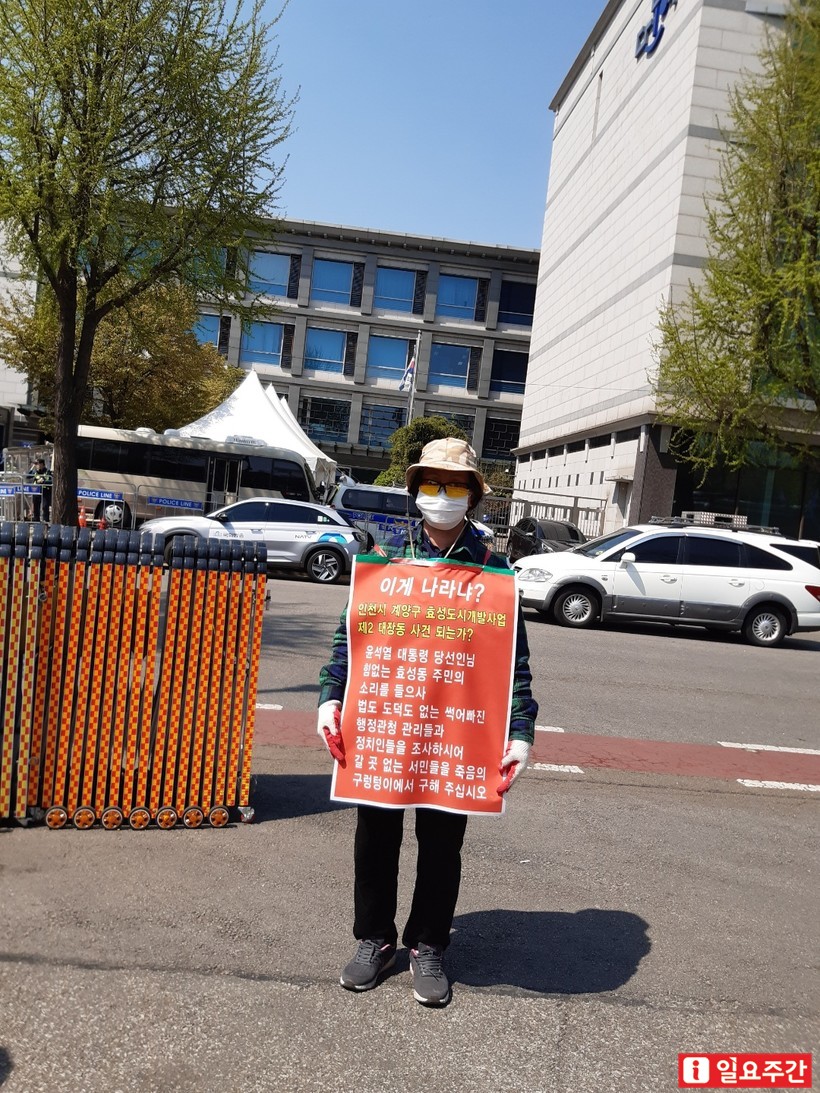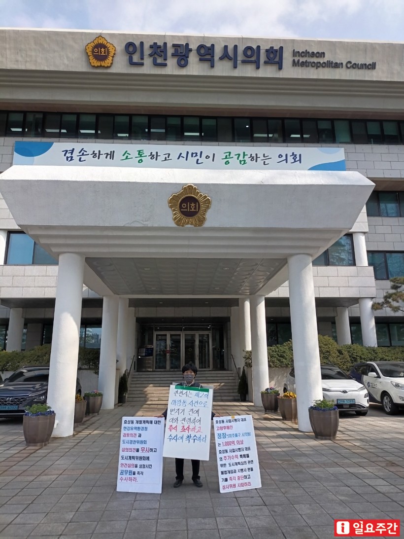 ▲효성지구비상대책위원회는 지난 4일부터 인천시청 앞에서 효성도시개발사업 특혜 및 로비 의혹관 관련해 수사를 촉구하며 1인 시위를 벌이고 있다.