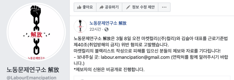 | ▲노동문제연구소 해방(解放)은 '마켓컬리 블랙리스트'로 피해를 입었다고 주장하는 노동자의 제보를 받고 (주)컬리와 김슬아 대표 등을 노동청에 고발했다.(해방 페이스북 캡쳐) |