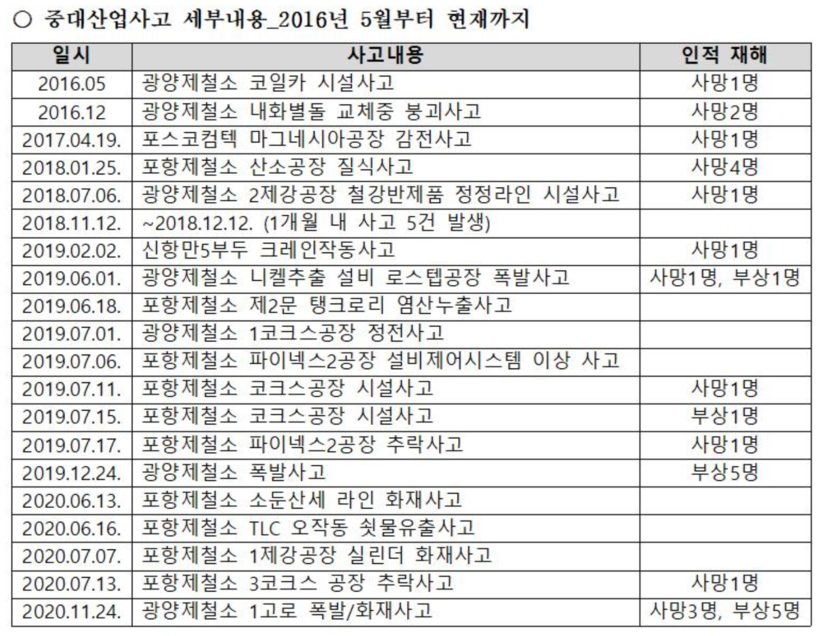 실제로도 최정우 포스코 회장 취임 이후 포스코는 환경, 노동, 안전 분야에서 크고 작은 사건 사고가 끊이지 않고 있다.