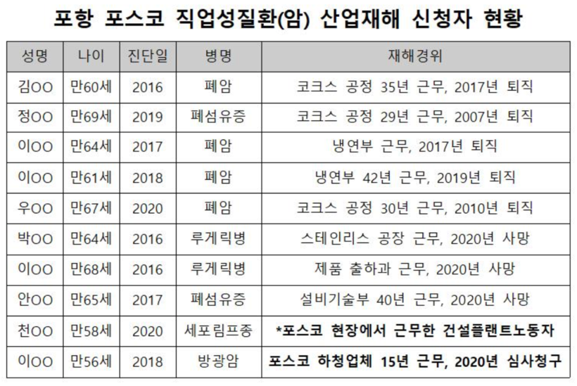 이들은 “포스코 현장에서 10년간 업무상질병으로 산재신청한 건수는 43건이었고 이 중 직업성암관련 신청은 단 4건에 불과한 것이 현실이다”며 “포항 뿐아니라 타지역 제철소와 주요 석유화학 국가산단에서 암으로 고통받는 현장의 노동자들을 찾아 나설 것이다”고 예고했다.