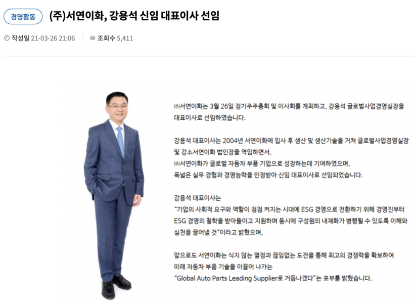 ▲(주)서연이화 강용석 대표이사. (사진=서연이화 제공) |
