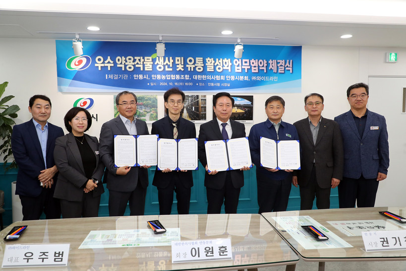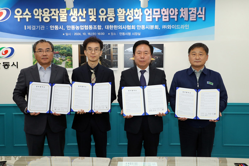 [일요주간=최부건 기자] 안동시(시장 권기창)는 10월 16일(수) 시청 시장실에서 안동농업협동조합(이하 안동농협), ㈜와이드라인, 대한한의사협회 안동시분회와 안동의 우수 약용작물 생산 및 유통 활성화를 위해 상호협력하는 업무협약서(MOU)를 체결했다.