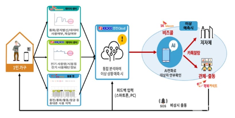 - 전력량·통화수발신·휴대폰 앱 등으로 데이터 종합 감지하여 대상자 안부 확인
