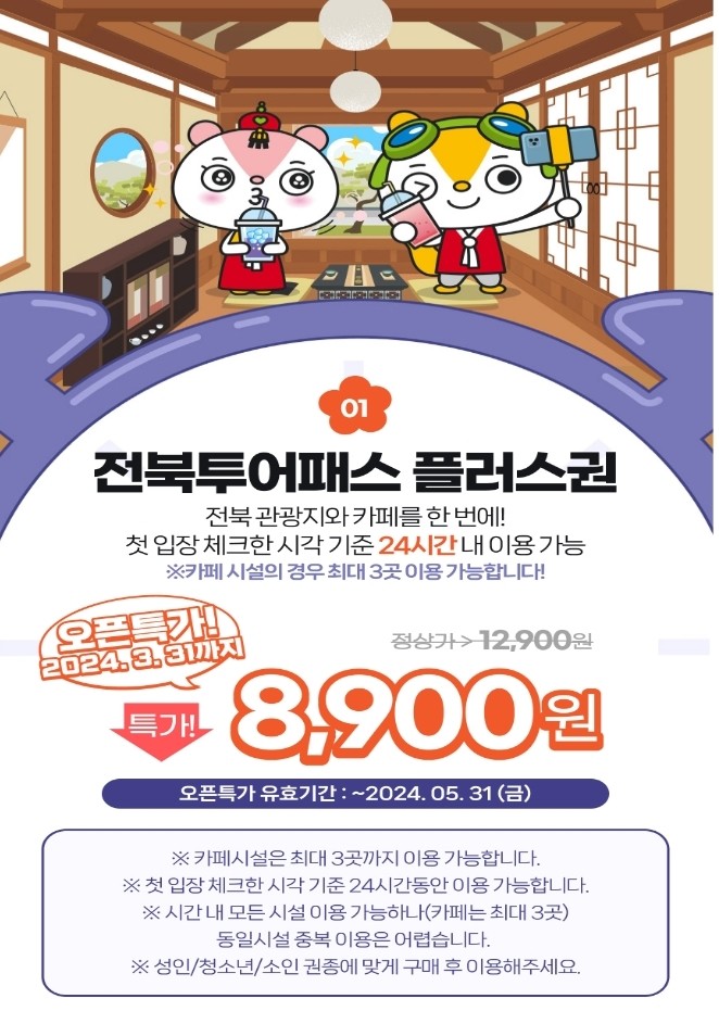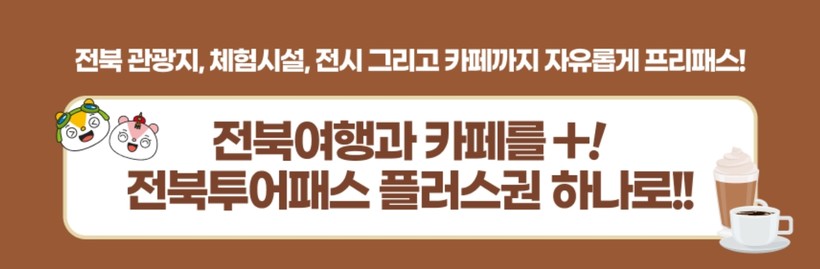 ‘전북투어패스 카페 플러스권’의 가격은 12,900원으로 기존 통합이용권(5,900원/매)으로 누릴 수 있던 70여개의 자유이용시설 외에, 추가로 제휴시설에 없던 카페까지 무료 이용할 수 있는 신규 상품이다.