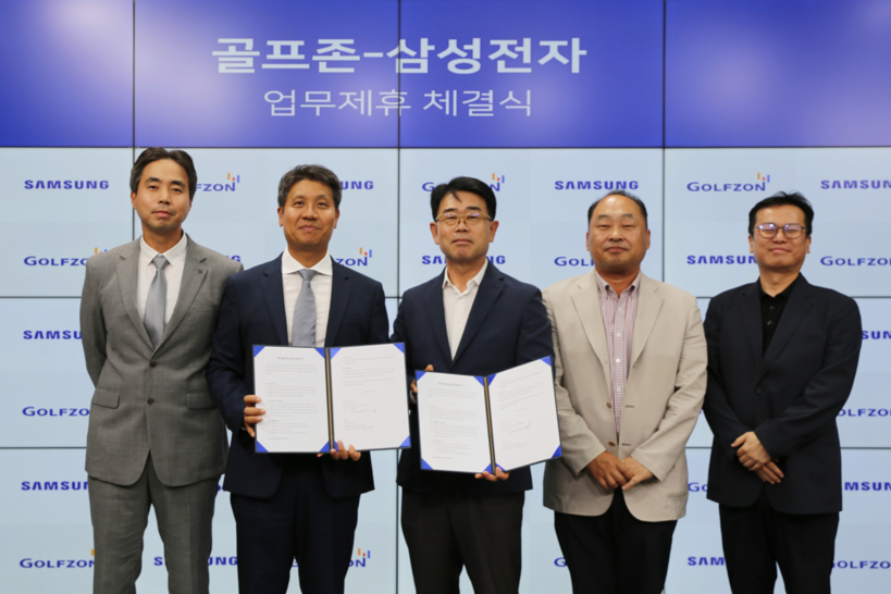협약식은 지난 2일 골프존타워서울에서 골프존 박강수 대표와 송영범 상무, 삼성전자 한국총괄 B2B영업팀 오치오 팀장, 이계원 상무, 정세환 상무가 참여한 가운데 진행됐다.
