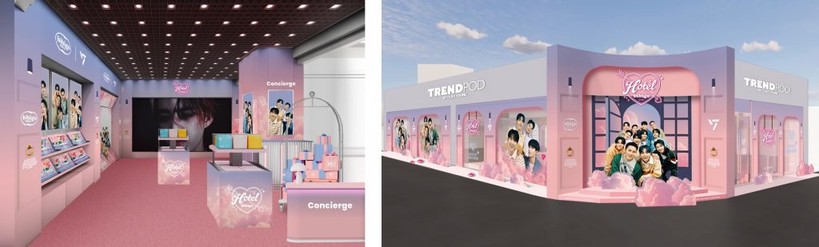 ▲ 세븐틴 데뷔 10주년 생일파티를 컨셉으로 CJ제일제당이 올리브영 명동역점(왼쪽)과 트렌드팟 바이 올리브영 홍대(오른쪽)에서 운영하는 ‘비비고 호텔’ 팝업. (사진=CJ 제일제당 제공) |