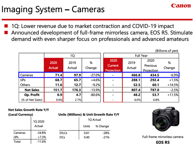 해외 IT 전문 온라인 매체 petapixel에서 캐논의 1분기 전체 재무 보고서 가운데 이미징 사업과 관련된 주요 결과와 카메라 부문에 관해 요약한 바에 따르면, 코로나19가 세계 경제의 전반적인 상황을 완전하게 변화시켰으며 대공황 이후 최악의 불황에 직면했다고 한다. 캐논의 하락세는 올 2월 중순부터 시작되었고 3월 말까지 회사 전체의 순 매출은 9.5%, 영업 이익은 18.7%감소했다.